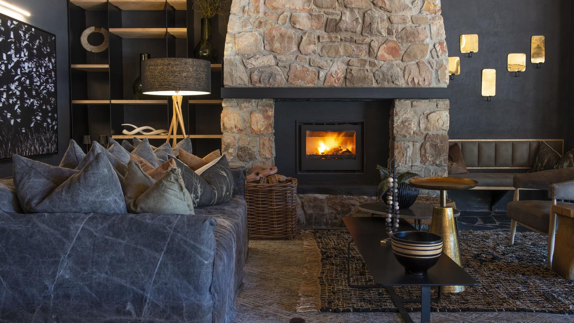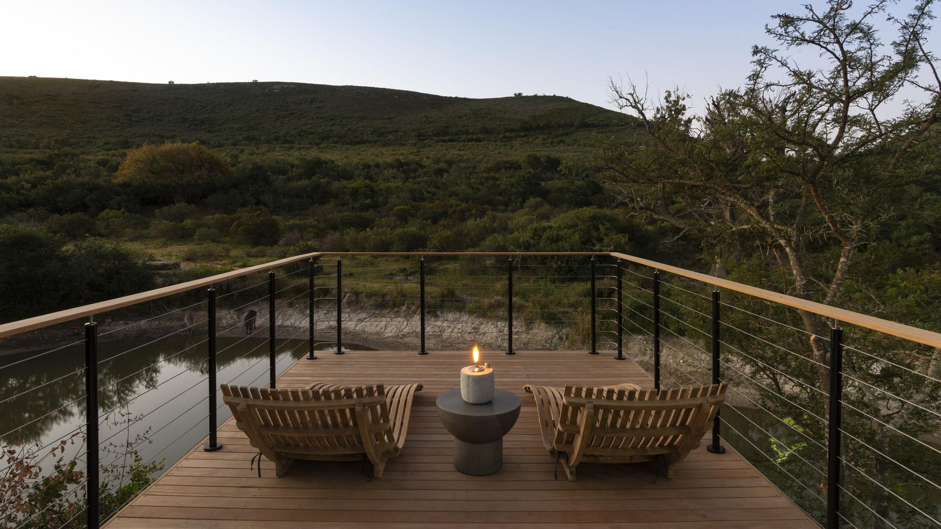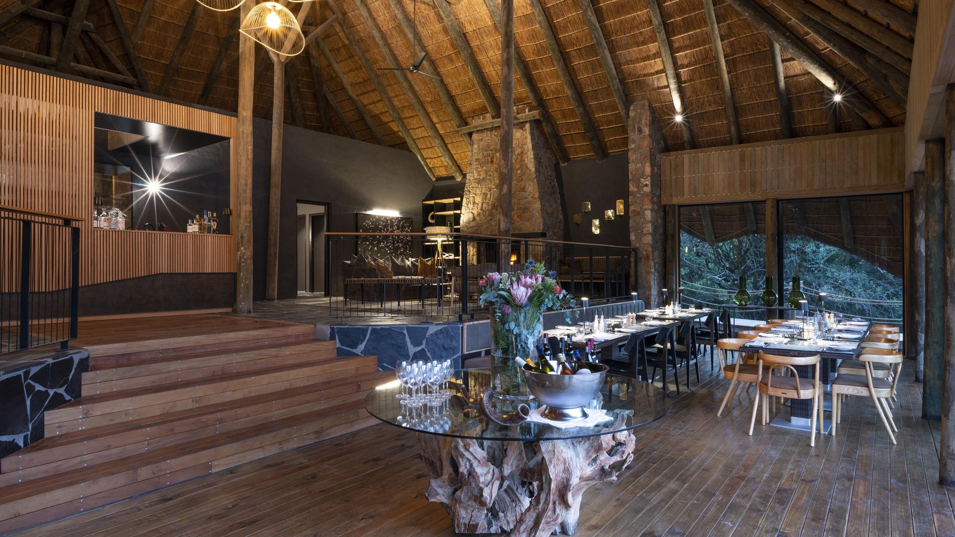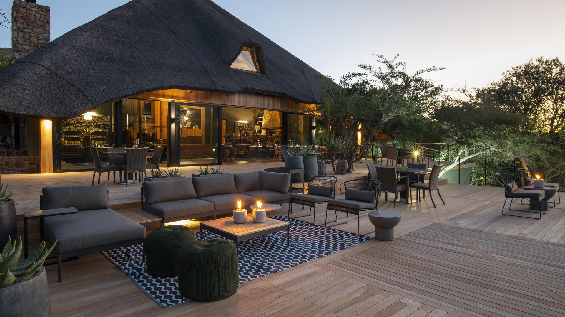 - Huvudlodge och terrass med utsikt över vattenhål